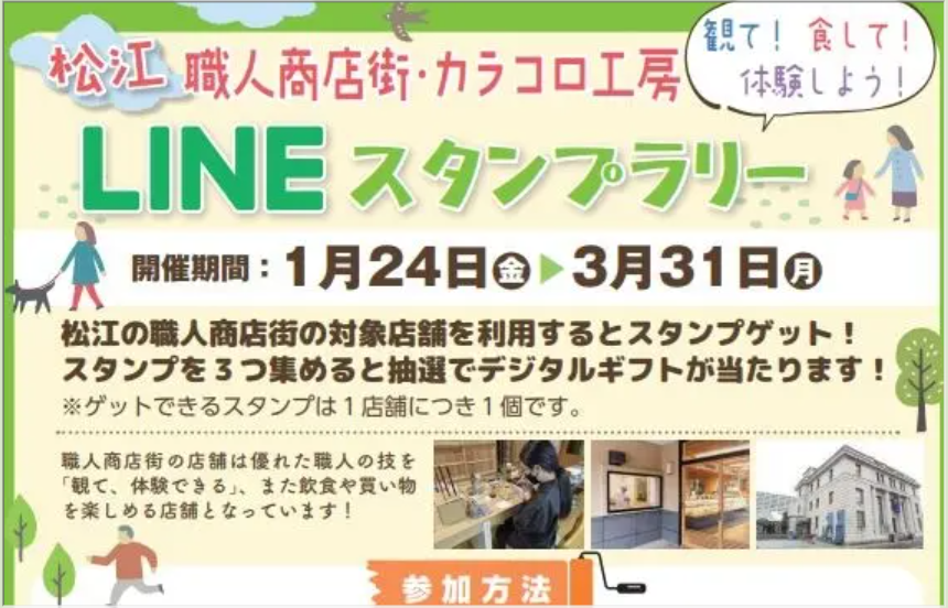【免責事項】当Webサイトに掲載しているスタンプラリー情報は主催者の提供する情報をもとにしており、当協会において内容を保証するものではございません。掲載内容の不備による損害等については責任を負いかねます。また当Webサイトに掲載の情報やURLは予告なしに変更または中止されることがあります。「松江職人商店街・カラコロ工房 LINEスタンプラリー」に関するお問い合わせは、当協会ではなく開催団体までお願いいたします。