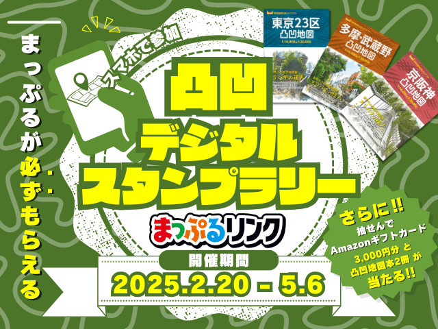 今回のスタンプラリーは昭文社出版の高低差を楽しむ「凸凹地図」シリーズより、地形の達人たちが選んだおすすめスポットをめぐるスタンプリーとなっています。