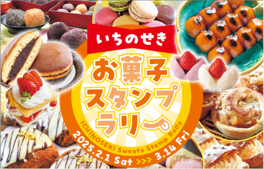 いちのせきお菓子スタンプラリーを開催します。店舗を周ってスタンプを集め、賞品に応募してください!