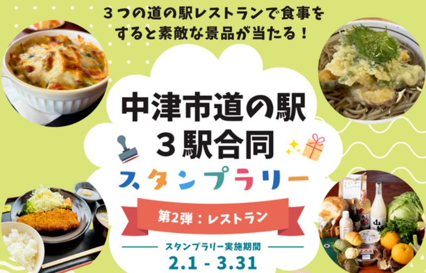【免責事項】当Webサイトに掲載しているスタンプラリー情報は主催者の提供する情報をもとにしており、当協会において内容を保証するものではございません。掲載内容の不備による損害等については責任を負いかねます。また当Webサイトに掲載の情報やURLは予告なしに変更または中止されることがあります。「中津市道の駅3駅合同スタンプラリー」に関するお問い合わせは、当協会ではなく開催団体までお願いいたします。
