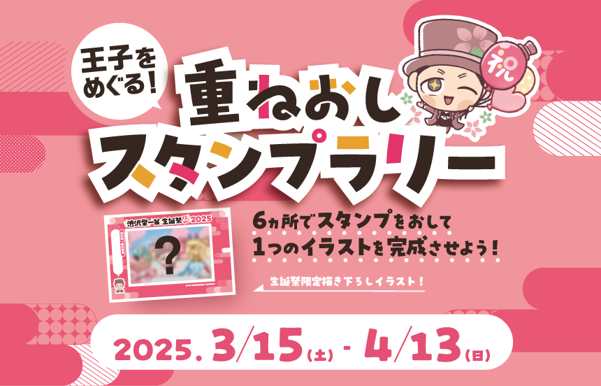 【免責事項】当Webサイトに掲載しているスタンプラリー情報は主催者の提供する情報をもとにしており、当協会において内容を保証するものではございません。掲載内容の不備による損害等については責任を負いかねます。また当Webサイトに掲載の情報やURLは予告なしに変更または中止されることがあります。「王子をめぐる!重ねおしスタンプラリー」に関するお問い合わせは、当協会ではなく開催団体までお願いいたします。