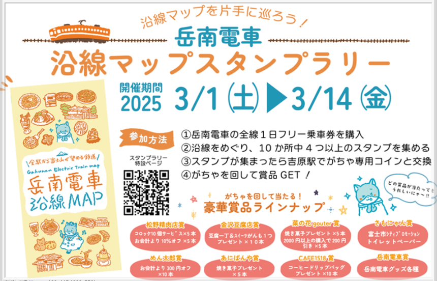 これは,2024(令和6)年末にリニューアルした沿線マップをより多くの方に知っていただき,実際に沿線を巡って富士市の魅力を再発見することを目的に開催するものです.沿線マップのモデルコースを参考に,沿線の店舗や駅に設置されているスタンプを集め,吉原駅でガチャを回すと賞品がプレゼントされます.