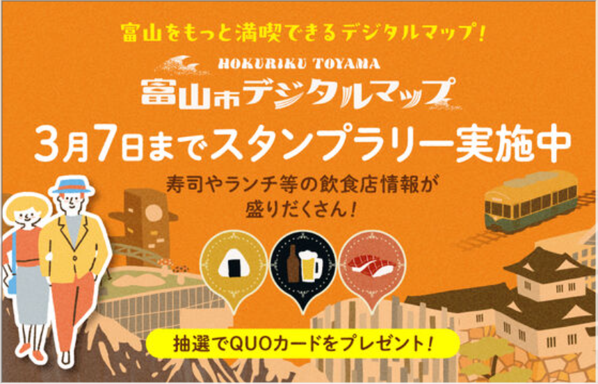 【免責事項】当Webサイトに掲載しているスタンプラリー情報は主催者の提供する情報をもとにしており、当協会において内容を保証するものではございません。掲載内容の不備による損害等については責任を負いかねます。また当Webサイトに掲載の情報やURLは予告なしに変更または中止されることがあります。「【富山市デジタルマップ】スタンプラリー」に関するお問い合わせは、当協会ではなく開催団体までお願いいたします。