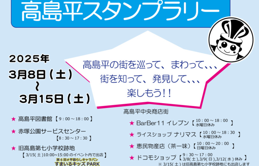 【免責事項】当Webサイトに掲載しているスタンプラリー情報は主催者の提供する情報をもとにしており、当協会において内容を保証するものではございません。掲載内容の不備による損害等については責任を負いかねます。また当Webサイトに掲載の情報やURLは予告なしに変更または中止されることがあります。「高島平スタンプラリー」に関するお問い合わせは、当協会ではなく開催団体までお願いいたします。