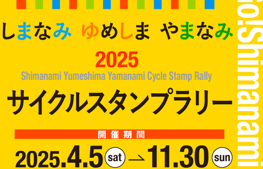 【免責事項】当Webサイトに掲載しているスタンプラリー情報は主催者の提供する情報をもとにしており、当協会において内容を保証するものではございません。掲載内容の不備による損害等については責任を負いかねます。また当Webサイトに掲載の情報やURLは予告なしに変更または中止されることがあります。「しまなみ ゆめしま やまなみサイクルスタンプラリー2025」に関するお問い合わせは、当協会ではなく開催団体までお願いいたします。