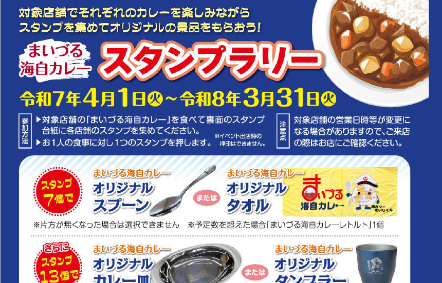 スタンプラリーの景品は、スタンプ7個で「オリジナルスプーン」または「オリジナルタオル」(※予定数を超えた場合「まいづる海自カレー」レトルト1個)、スタンプ13個で「オリジナルカレー皿」または「オリジナルタンブラー」(※予定数を超えた場合「まいづる海自カレー」レトルト3個)を贈呈。さらにスタンプ16個全店舗制覇された方の中から、抽選で20人に「オリジナル鉄板」または「まいづる海自カレーレトルト12種類詰め合わせ」をプレゼントします。