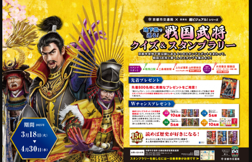 株式会社西東社が出版するかっこいい人物イラストとわかりやすい解説で人気の歴史学習本「超ビジュアル!」シリーズとコラボレーションし、令和7年3月18日(火)から4月30日(水)まで「地下鉄で巡る!戦国武将クイズ&スタンプラリー」を開催します。