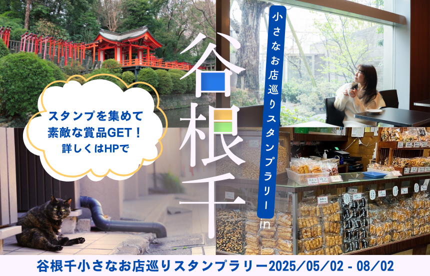 【免責事項】当Webサイトに掲載しているスタンプラリー情報は主催者の提供する情報をもとにしており、当協会において内容を保証するものではございません。掲載内容の不備による損害等については責任を負いかねます。また当Webサイトに掲載の情報やURLは予告なしに変更または中止されることがあります。「谷根千小さなお店巡りスタンプラリー」に関するお問い合わせは、当協会ではなく開催団体までお願いいたします。