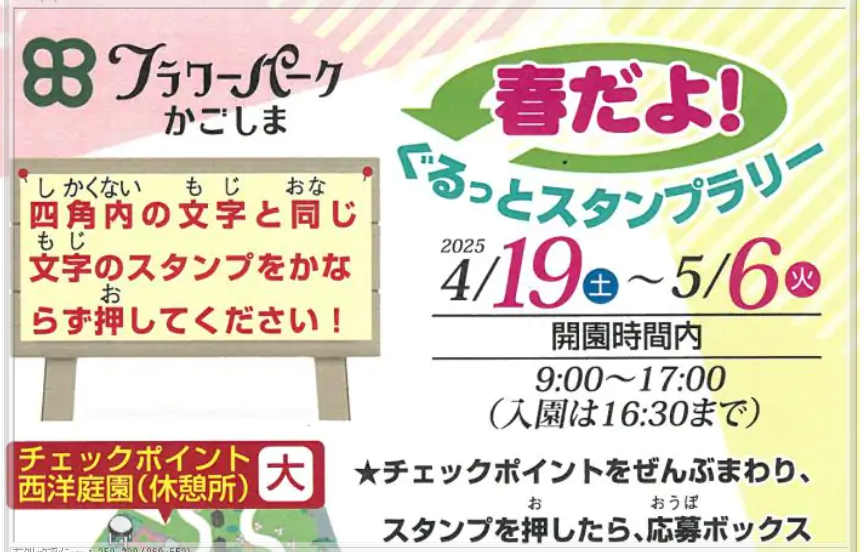 【免責事項】当Webサイトに掲載しているスタンプラリー情報は主催者の提供する情報をもとにしており、当協会において内容を保証するものではございません。掲載内容の不備による損害等については責任を負いかねます。また当Webサイトに掲載の情報やURLは予告なしに変更または中止されることがあります。「フラワーパークかごしま 春だよ!ぐるっとスタンプラリー 」に関するお問い合わせは、当協会ではなく開催団体までお願いいたします。