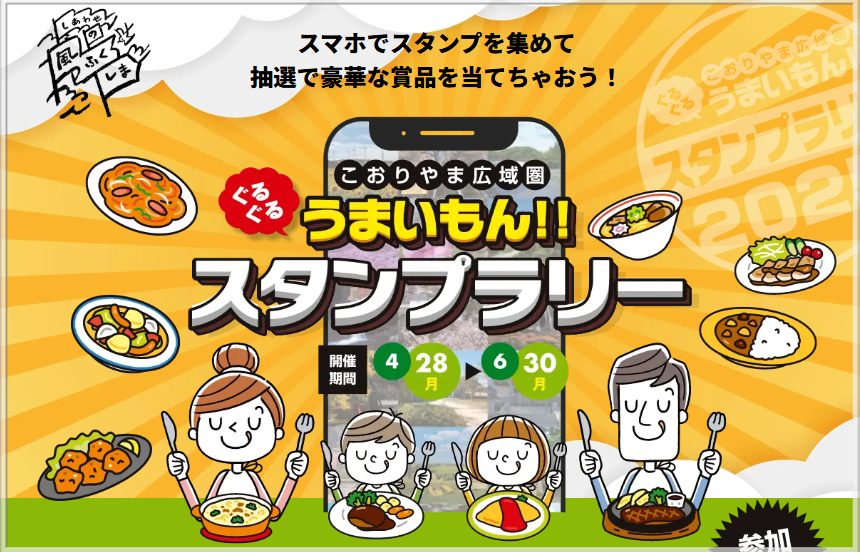 【免責事項】当Webサイトに掲載しているスタンプラリー情報は主催者の提供する情報をもとにしており、当協会において内容を保証するものではございません。掲載内容の不備による損害等については責任を負いかねます。また当Webサイトに掲載の情報やURLは予告なしに変更または中止されることがあります。「こおりやま広域圏 ぐるぐるうまいもん‼スタンプラリー」に関するお問い合わせは、当協会ではなく開催団体までお願いいたします。