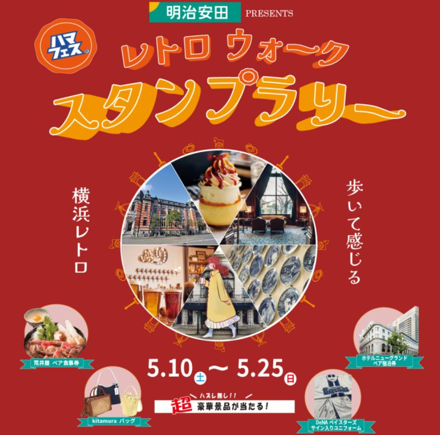 【免責事項】当Webサイトに掲載しているスタンプラリー情報は主催者の提供する情報をもとにしており、当協会において内容を保証するものではございません。掲載内容の不備による損害等については責任を負いかねます。また当Webサイトに掲載の情報やURLは予告なしに変更または中止されることがあります。「明治安田Presents「ハマフェスレトロウォークスタンプラリー」」に関するお問い合わせは、当協会ではなく開催団体までお願いいたします。