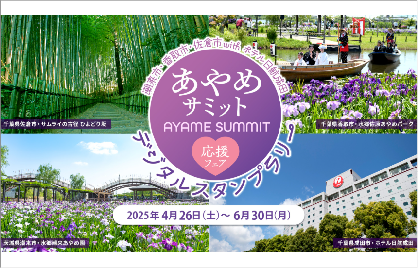 【免責事項】当Webサイトに掲載しているスタンプラリー情報は主催者の提供する情報をもとにしており、当協会において内容を保証するものではございません。掲載内容の不備による損害等については責任を負いかねます。また当Webサイトに掲載の情報やURLは予告なしに変更または中止されることがあります。「あやめサミット デジタルスタンプラリー」に関するお問い合わせは、当協会ではなく開催団体までお願いいたします。