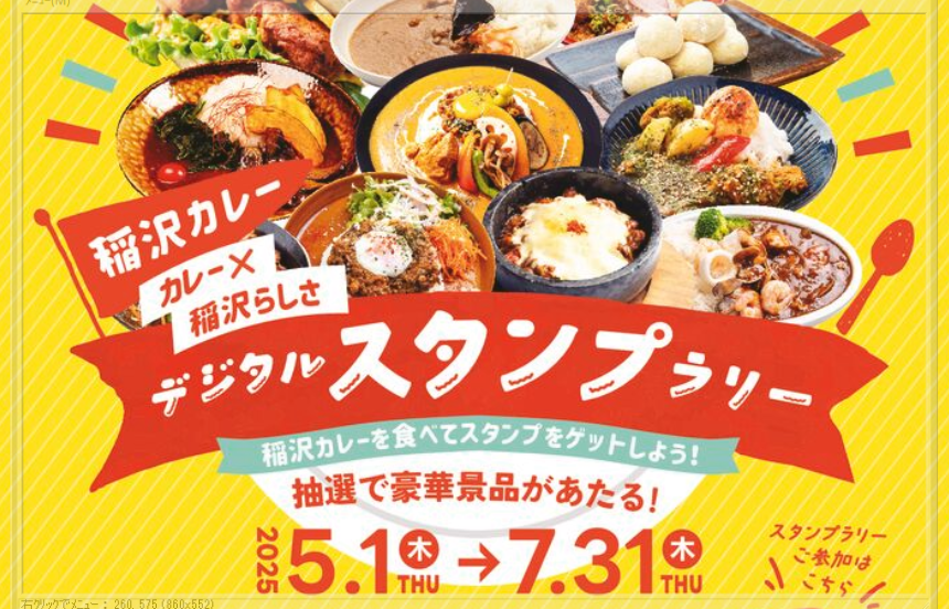 『華麗(カレー)なるまち稲沢』2025年度第一弾の取り組みとして ”稲沢ご当地グルメ”(カレーを使った料理×稲沢らしさ)デジタルスタンプラリーを実施いたします。29店舗が提供する”稲沢ご当地カレー”を食べて、スタンプを集め、素敵な賞品をゲットしましょう!