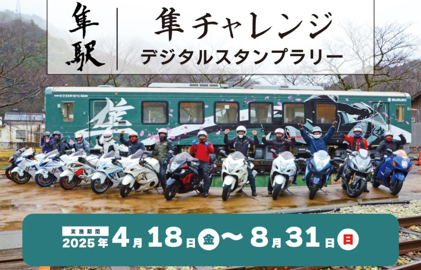 2025年8月31日までの期間中にこの2地点を訪れ、WEBアプリ「鉄印帳デジタル」を使ってデジタルスタンプを獲得した方には達成特典として、「隼」と若桜鉄道の「隼」ラッピング列車が並走する特別な限定動画をプレゼント。さらに達成者が2025年8月10日に隼駅近くで行われる「第15回隼駅まつり」を訪れると、スズキのオリジナルノベルティを受け取れます。
