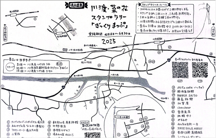 【免責事項】当Webサイトに掲載しているスタンプラリー情報は主催者の提供する情報をもとにしており、当協会において内容を保証するものではございません。掲載内容の不備による損害等については責任を負いかねます。また当Webサイトに掲載の情報やURLは予告なしに変更または中止されることがあります。「川渡温泉 菜の花スタンプラリー2025」に関するお問い合わせは、当協会ではなく開催団体までお願いいたします。