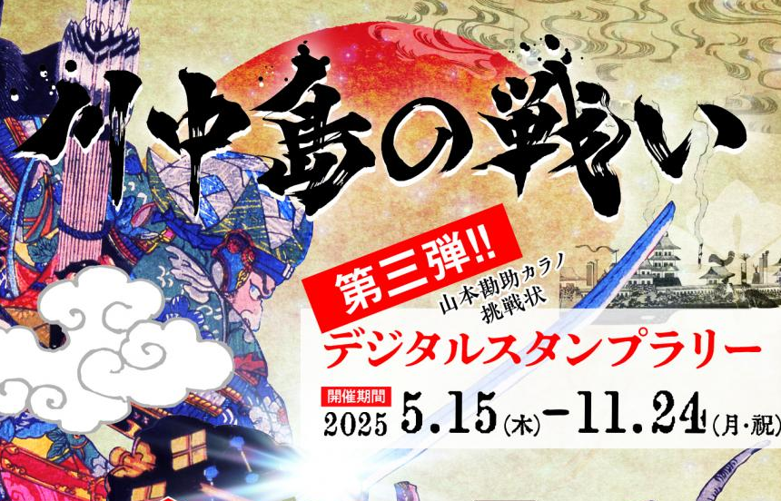 【免責事項】当Webサイトに掲載しているスタンプラリー情報は主催者の提供する情報をもとにしており、当協会において内容を保証するものではございません。掲載内容の不備による損害等については責任を負いかねます。また当Webサイトに掲載の情報やURLは予告なしに変更または中止されることがあります。「川中島の戦いデジタルスタンプラリー第三弾」に関するお問い合わせは、当協会ではなく開催団体までお願いいたします。