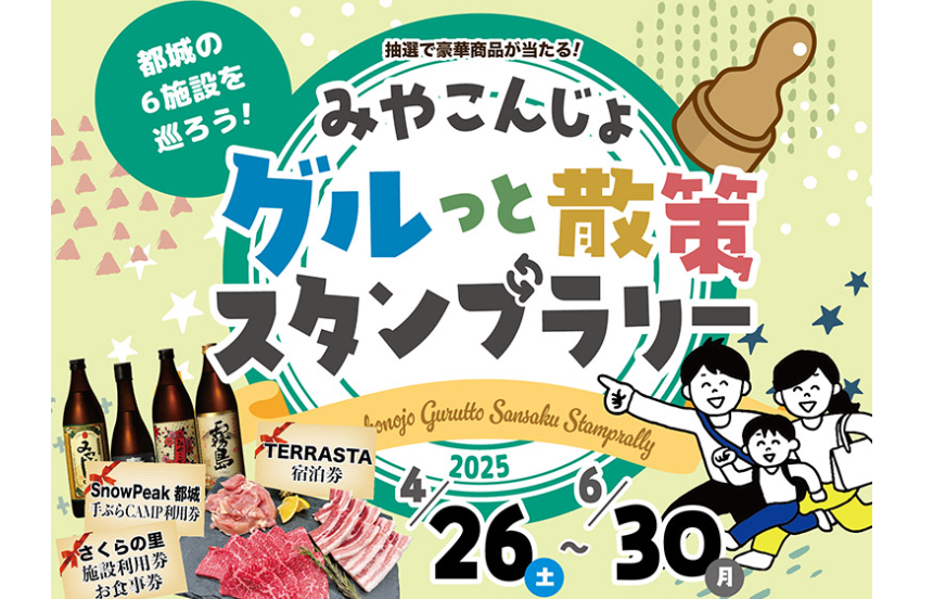 【免責事項】当Webサイトに掲載しているスタンプラリー情報は主催者の提供する情報をもとにしており、当協会において内容を保証するものではございません。掲載内容の不備による損害等については責任を負いかねます。また当Webサイトに掲載の情報やURLは予告なしに変更または中止されることがあります。「みやこんじょ グルっと散策スタンプラリー」に関するお問い合わせは、当協会ではなく開催団体までお願いいたします。