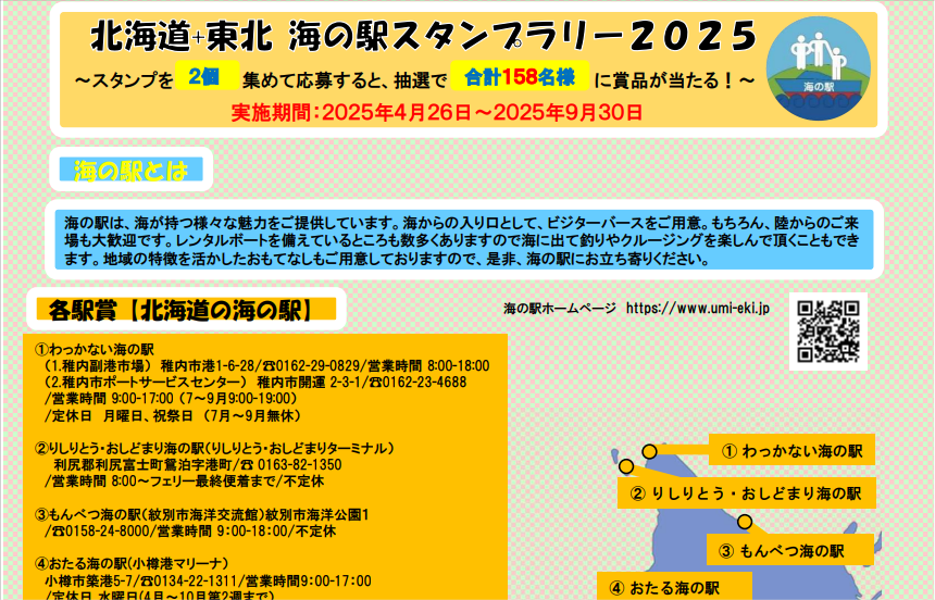 「わっかない海の駅(北海道稚内市)」から「いわき海の駅(福島県いわき市)」まで、北海道と東北地域で海の駅に登録された計14カ所で、特産品が当たるスタンプラリー、「北海道+東北 海の駅スタンプラリー 2025」が実施中です。