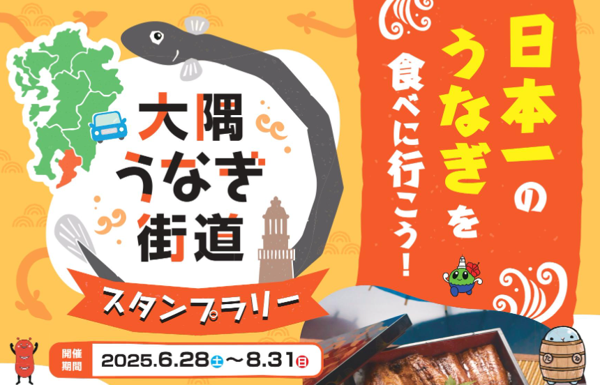 【免責事項】当Webサイトに掲載しているスタンプラリー情報は主催者の提供する情報をもとにしており、当協会において内容を保証するものではございません。掲載内容の不備による損害等については責任を負いかねます。また当Webサイトに掲載の情報やURLは予告なしに変更または中止されることがあります。「大隅うなぎ街道スタンプラリー」に関するお問い合わせは、当協会ではなく開催団体までお願いいたします。