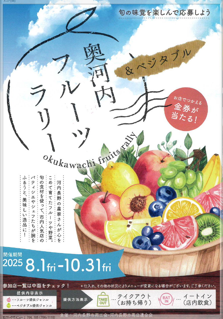 【免責事項】当Webサイトに掲載しているスタンプラリー情報は主催者の提供する情報をもとにしており、当協会において内容を保証するものではございません。掲載内容の不備による損害等については責任を負いかねます。また当Webサイトに掲載の情報やURLは予告なしに変更または中止されることがあります。「奥河内フルーツラリー&ベジタブル 2025」に関するお問い合わせは、当協会ではなく開催団体までお願いいたします。