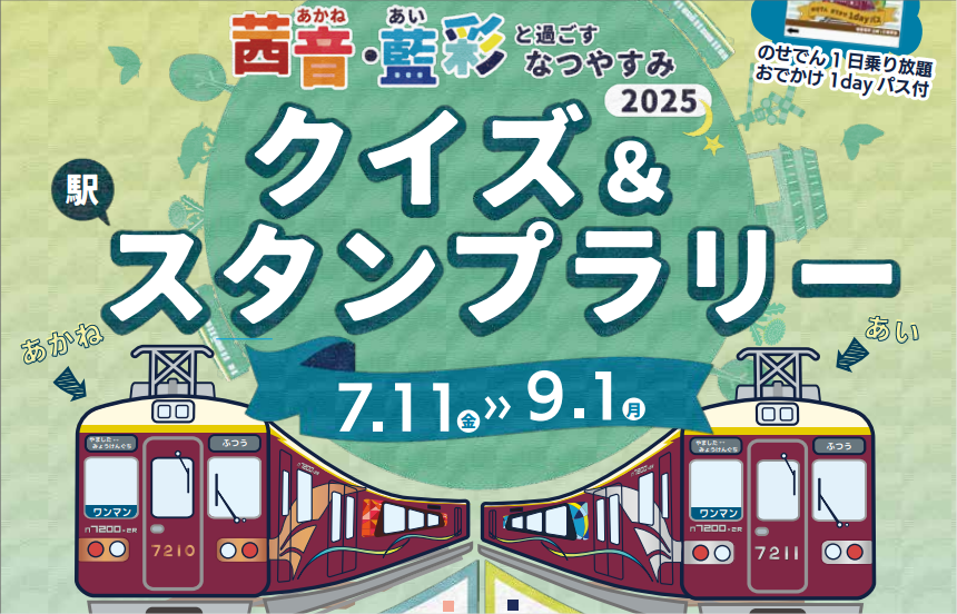 能勢電鉄では、2025 年3 月にデビューしたラッピング列車7200 系×2 両編成車の「茜音あかね」「藍あ彩い」に、より多くの皆さまに親しんでいただきたく、夏休み限定イベント「クイズ&スタンプラリ-」を開催します。