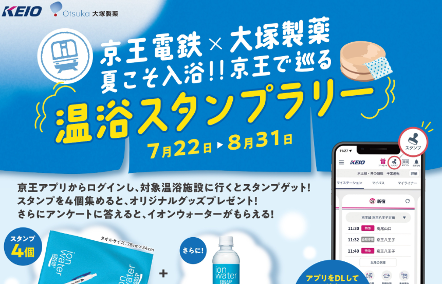 京王アプリをダウンロードし、スタンプラリーの対象となる温浴施設(以下「各施設」)を巡り合計4施設分のスタンプを集めていただくと、先着で景品をプレゼントします。
