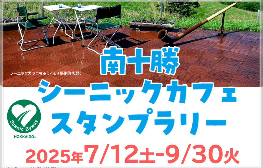 【免責事項】当Webサイトに掲載しているスタンプラリー情報は主催者の提供する情報をもとにしており、当協会において内容を保証するものではございません。掲載内容の不備による損害等については責任を負いかねます。また当Webサイトに掲載の情報やURLは予告なしに変更または中止されることがあります。「南十勝シーニックカフェスタンプラリー2025」に関するお問い合わせは、当協会ではなく開催団体までお願いいたします。