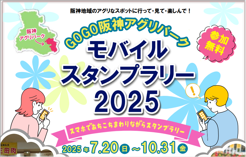 阪神北県民局では、阪神地域の多様な「農」と食の拠点をアトラクションと位置づけ、地域全体をテーマパークに見立て、様々な交流や連携を進めることで、都市・都市近郊農業の振興を図ることを目的とした「阪神アグリパーク構想」を推進しております。この度は、その取り組みの一環として、阪神地域の益々の魅力アップをめざすモバイルスタンプラリーを実施します。