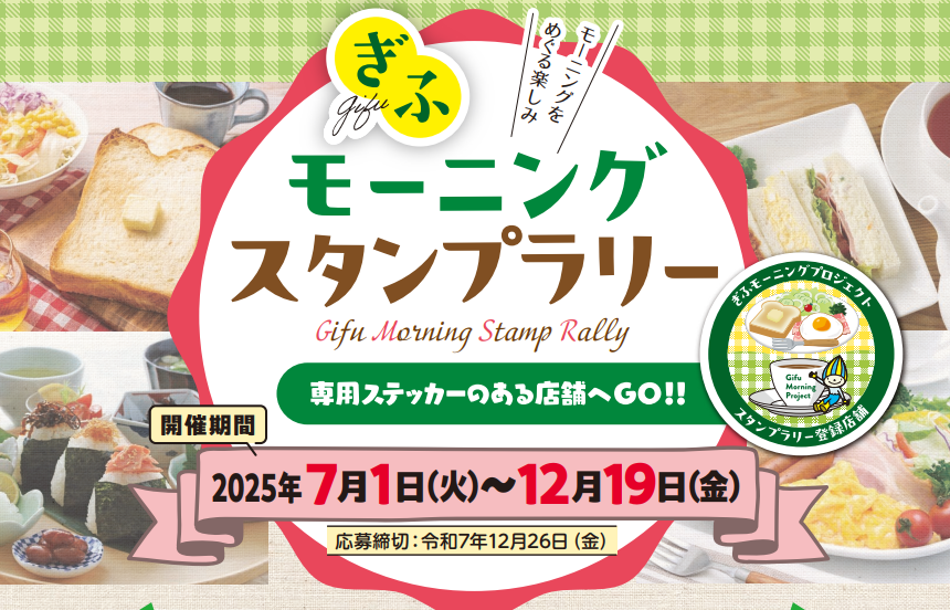 【免責事項】当Webサイトに掲載しているスタンプラリー情報は主催者の提供する情報をもとにしており、当協会において内容を保証するものではございません。掲載内容の不備による損害等については責任を負いかねます。また当Webサイトに掲載の情報やURLは予告なしに変更または中止されることがあります。「ぎふモーニングスタンプラリー」に関するお問い合わせは、当協会ではなく開催団体までお願いいたします。