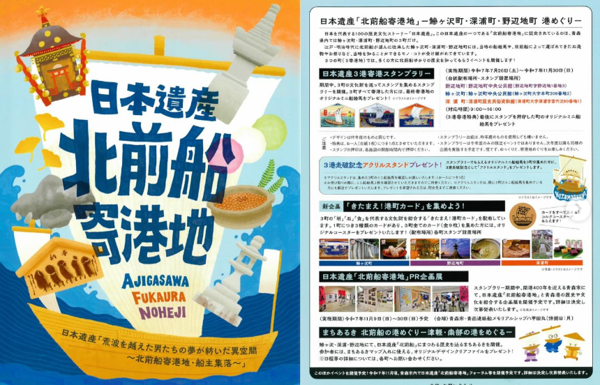 【免責事項】当Webサイトに掲載しているスタンプラリー情報は主催者の提供する情報をもとにしており、当協会において内容を保証するものではございません。掲載内容の不備による損害等については責任を負いかねます。また当Webサイトに掲載の情報やURLは予告なしに変更または中止されることがあります。「日本遺産「北前船寄港地」ー鰺ヶ沢町・深浦町・野辺地町 港めぐりー」に関するお問い合わせは、当協会ではなく開催団体までお願いいたします。