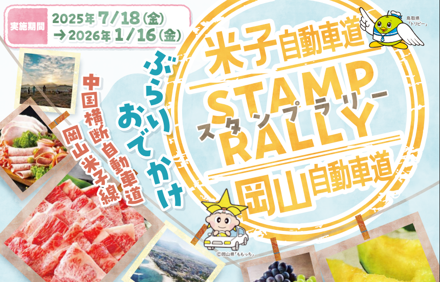 【免責事項】当Webサイトに掲載しているスタンプラリー情報は主催者の提供する情報をもとにしており、当協会において内容を保証するものではございません。掲載内容の不備による損害等については責任を負いかねます。また当Webサイトに掲載の情報やURLは予告なしに変更または中止されることがあります。「中国横断自動車道岡山米子線ぶらりおでかけスタンプラリー」に関するお問い合わせは、当協会ではなく開催団体までお願いいたします。