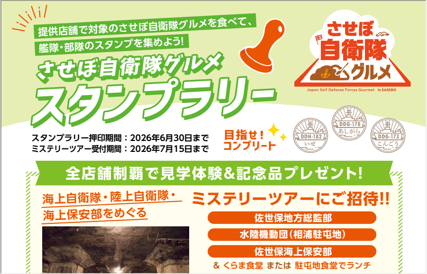 【免責事項】当Webサイトに掲載しているスタンプラリー情報は主催者の提供する情報をもとにしており、当協会において内容を保証するものではございません。掲載内容の不備による損害等については責任を負いかねます。また当Webサイトに掲載の情報やURLは予告なしに変更または中止されることがあります。「させぼ自衛隊グルメ スタンプラリー」に関するお問い合わせは、当協会ではなく開催団体までお願いいたします。