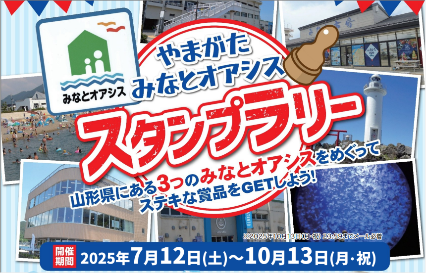【免責事項】当Webサイトに掲載しているスタンプラリー情報は主催者の提供する情報をもとにしており、当協会において内容を保証するものではございません。掲載内容の不備による損害等については責任を負いかねます。また当Webサイトに掲載の情報やURLは予告なしに変更または中止されることがあります。「やまがたみなとオアシススタンプラリー」に関するお問い合わせは、当協会ではなく開催団体までお願いいたします。