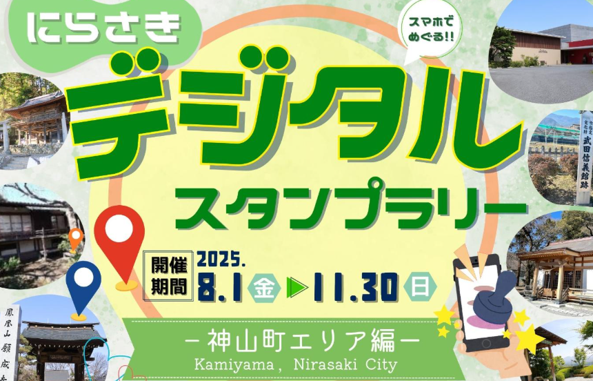 【免責事項】当Webサイトに掲載しているスタンプラリー情報は主催者の提供する情報をもとにしており、当協会において内容を保証するものではございません。掲載内容の不備による損害等については責任を負いかねます。また当Webサイトに掲載の情報やURLは予告なしに変更または中止されることがあります。「にらさきデジタルスタンプラリー(神山町エリア編)」に関するお問い合わせは、当協会ではなく開催団体までお願いいたします。