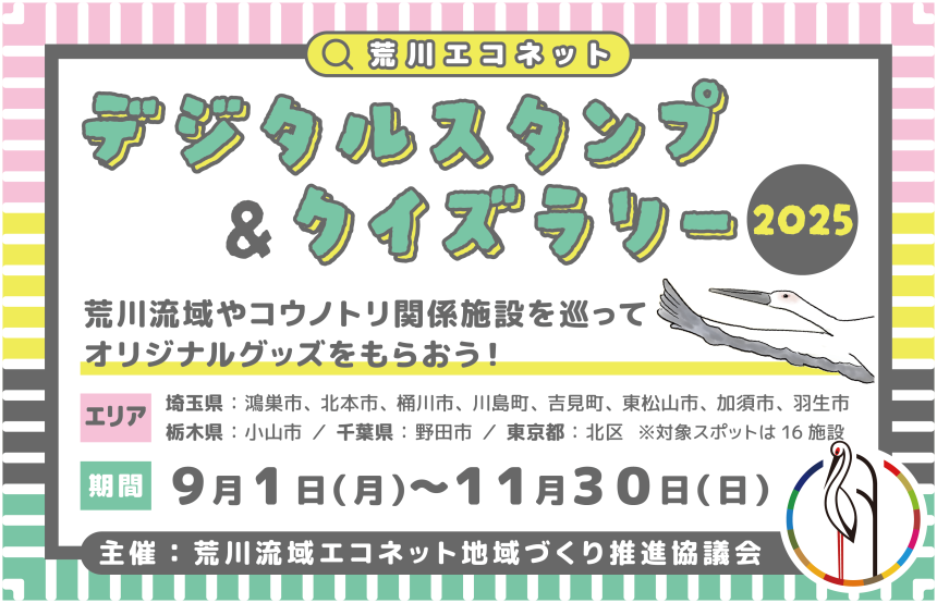埼玉県内の荒川周辺地域や、県外のコウノトリ関連施設等を巡るデジタルスタンプラリーです。