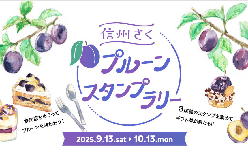 【免責事項】当Webサイトに掲載しているスタンプラリー情報は主催者の提供する情報をもとにしており、当協会において内容を保証するものではございません。掲載内容の不備による損害等については責任を負いかねます。また当Webサイトに掲載の情報やURLは予告なしに変更または中止されることがあります。「信州さくプルーンスタンプラリー」に関するお問い合わせは、当協会ではなく開催団体までお願いいたします。