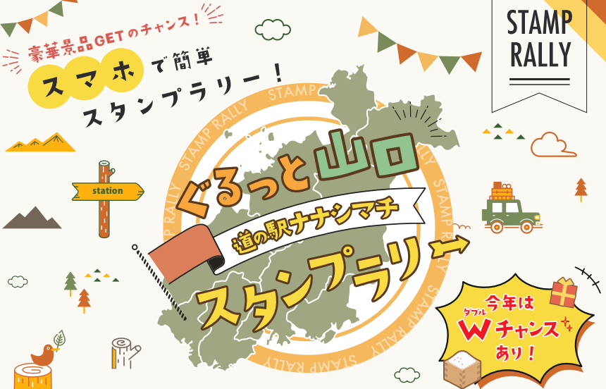 【免責事項】当Webサイトに掲載しているスタンプラリー情報は主催者の提供する情報をもとにしており、当協会において内容を保証するものではございません。掲載内容の不備による損害等については責任を負いかねます。また当Webサイトに掲載の情報やURLは予告なしに変更または中止されることがあります。「ぐるっと山口道の駅ナナシマチスタンプラリー」に関するお問い合わせは、当協会ではなく開催団体までお願いいたします。