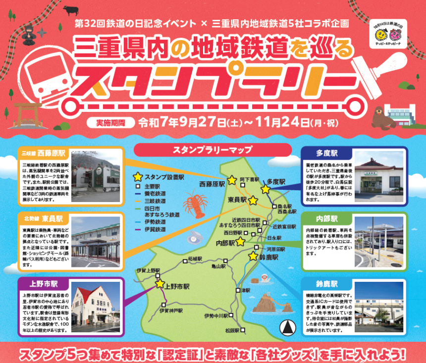 【免責事項】当Webサイトに掲載しているスタンプラリー情報は主催者の提供する情報をもとにしており、当協会において内容を保証するものではございません。掲載内容の不備による損害等については責任を負いかねます。また当Webサイトに掲載の情報やURLは予告なしに変更または中止されることがあります。「三重県内の地域鉄道を巡るスタンプラリー~第32回鉄道の日記念イベント・三重県内地域鉄道5社コラボ企画~」に関するお問い合わせは、当協会ではなく開催団体までお願いいたします。