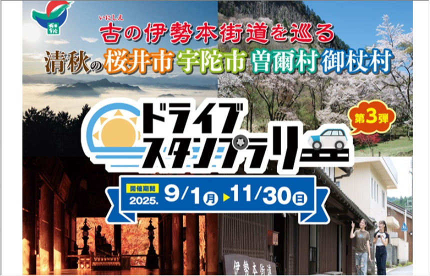 【免責事項】当Webサイトに掲載しているスタンプラリー情報は主催者の提供する情報をもとにしており、当協会において内容を保証するものではございません。掲載内容の不備による損害等については責任を負いかねます。また当Webサイトに掲載の情報やURLは予告なしに変更または中止されることがあります。「古の伊勢本街道を巡る清秋の桜井市・宇陀市・曽爾村・御杖村 ドライブスタンプラリー」に関するお問い合わせは、当協会ではなく開催団体までお願いいたします。