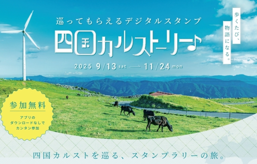 【免責事項】当Webサイトに掲載しているスタンプラリー情報は主催者の提供する情報をもとにしており、当協会において内容を保証するものではございません。掲載内容の不備による損害等については責任を負いかねます。また当Webサイトに掲載の情報やURLは予告なしに変更または中止されることがあります。「四国カルストーリー・デジタルスタンプラリー」に関するお問い合わせは、当協会ではなく開催団体までお願いいたします。