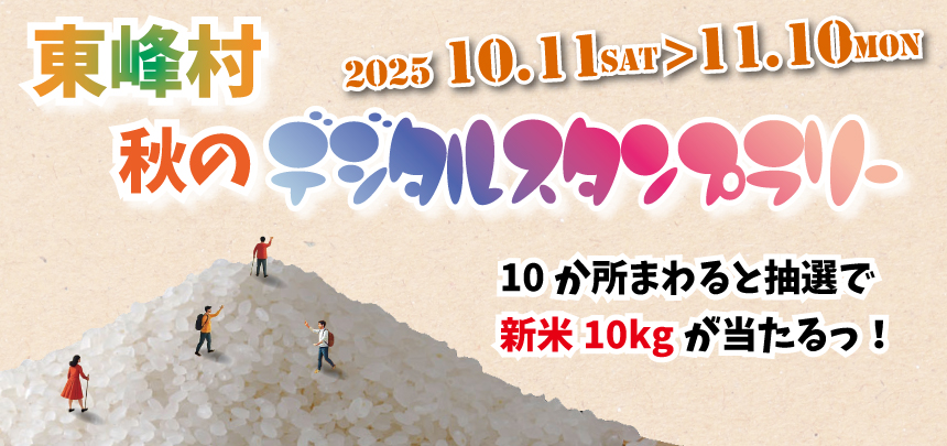 【免責事項】当Webサイトに掲載しているスタンプラリー情報は主催者の提供する情報をもとにしており、当協会において内容を保証するものではございません。掲載内容の不備による損害等については責任を負いかねます。また当Webサイトに掲載の情報やURLは予告なしに変更または中止されることがあります。「新米10kgが当たる!東峰村 秋の二大イベントと名所を巡る「秋のデジタルスタンプラリー」」に関するお問い合わせは、当協会ではなく開催団体までお願いいたします。