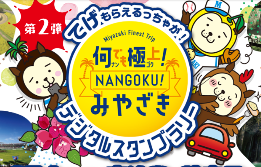 【免責事項】当Webサイトに掲載しているスタンプラリー情報は主催者の提供する情報をもとにしており、当協会において内容を保証するものではございません。掲載内容の不備による損害等については責任を負いかねます。また当Webサイトに掲載の情報やURLは予告なしに変更または中止されることがあります。「何でも極上!NANGOKUみやざきデジタルスタンプラリー」に関するお問い合わせは、当協会ではなく開催団体までお願いいたします。