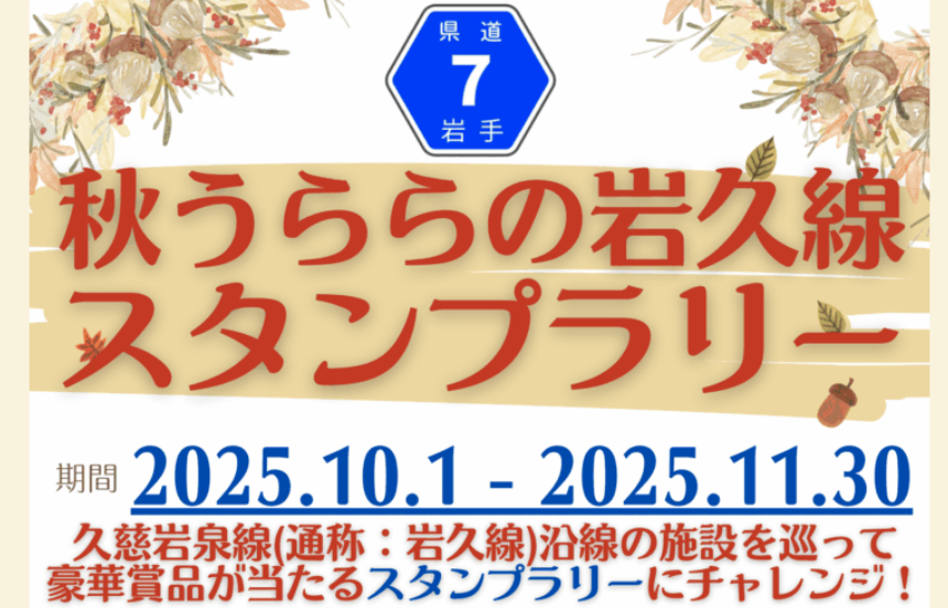 【免責事項】当Webサイトに掲載しているスタンプラリー情報は主催者の提供する情報をもとにしており、当協会において内容を保証するものではございません。掲載内容の不備による損害等については責任を負いかねます。また当Webサイトに掲載の情報やURLは予告なしに変更または中止されることがあります。「秋うららの岩久線スタンプラリー」に関するお問い合わせは、当協会ではなく開催団体までお願いいたします。