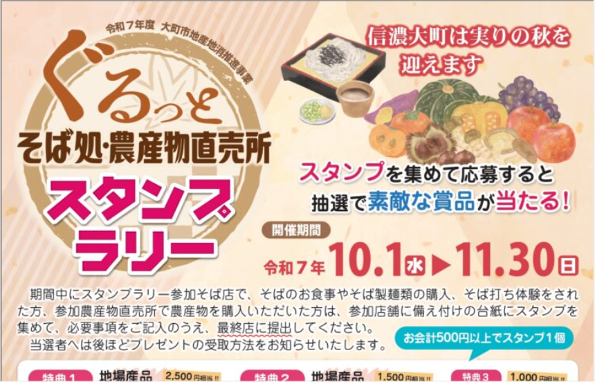 10月1日(水)から11月30日(日)まで、スタンプラリー参加のそば店でのそばのお食事やそば製麺類の購入、そば打ち体験、またはスタンプラリー参加農作物直売所での農作物の購入でスタンプをもらえます。(お会計500円以上から)