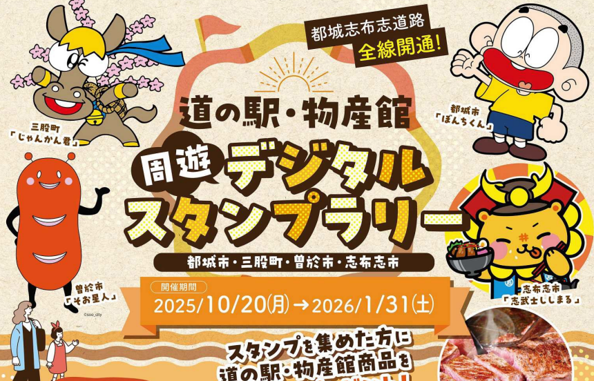 都城広域定住自立圏構想協議会(三股町、都城市、曽於市、志布志市)では、今年度で3回目の圏内の道の駅・物産館を周遊するデジタルスタンプラリーを実施いたします。
