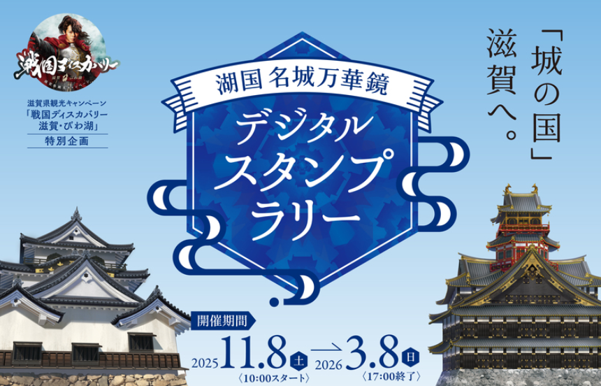 【免責事項】当Webサイトに掲載しているスタンプラリー情報は主催者の提供する情報をもとにしており、当協会において内容を保証するものではございません。掲載内容の不備による損害等については責任を負いかねます。また当Webサイトに掲載の情報やURLは予告なしに変更または中止されることがあります。「湖国名城万華鏡デジタルスタンプラリー」に関するお問い合わせは、当協会ではなく開催団体までお願いいたします。