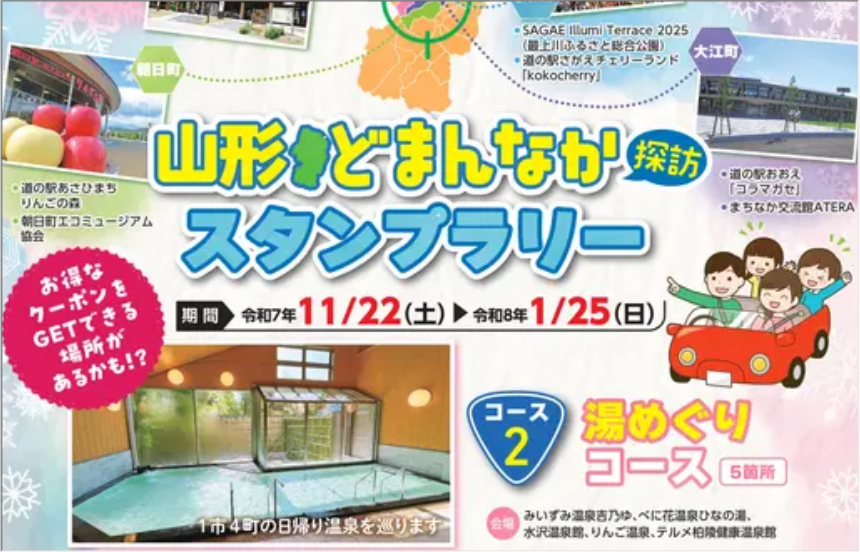 【免責事項】当Webサイトに掲載しているスタンプラリー情報は主催者の提供する情報をもとにしており、当協会において内容を保証するものではございません。掲載内容の不備による損害等については責任を負いかねます。また当Webサイトに掲載の情報やURLは予告なしに変更または中止されることがあります。「山形どまんなか探訪スタンプラリー」に関するお問い合わせは、当協会ではなく開催団体までお願いいたします。