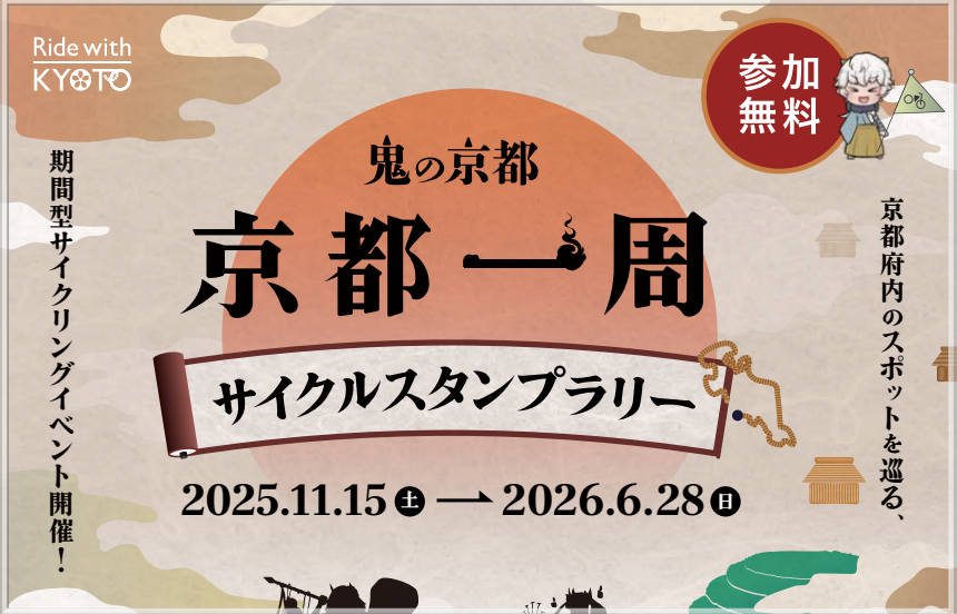 【免責事項】当Webサイトに掲載しているスタンプラリー情報は主催者の提供する情報をもとにしており、当協会において内容を保証するものではございません。掲載内容の不備による損害等については責任を負いかねます。また当Webサイトに掲載の情報やURLは予告なしに変更または中止されることがあります。「鬼の京都京都一周サイクルスタンプラリー」に関するお問い合わせは、当協会ではなく開催団体までお願いいたします。