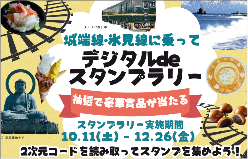 【免責事項】当Webサイトに掲載しているスタンプラリー情報は主催者の提供する情報をもとにしており、当協会において内容を保証するものではございません。掲載内容の不備による損害等については責任を負いかねます。また当Webサイトに掲載の情報やURLは予告なしに変更または中止されることがあります。「城端線・氷見線デジタルスタンプラリー」に関するお問い合わせは、当協会ではなく開催団体までお願いいたします。
