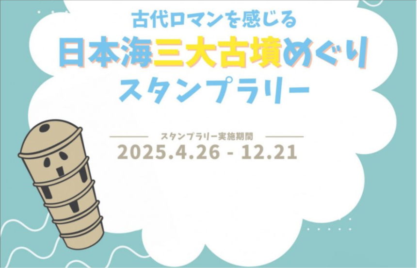 【免責事項】当Webサイトに掲載しているスタンプラリー情報は主催者の提供する情報をもとにしており、当協会において内容を保証するものではございません。掲載内容の不備による損害等については責任を負いかねます。また当Webサイトに掲載の情報やURLは予告なしに変更または中止されることがあります。「日本海三大古墳めぐりスタンプラリー」に関するお問い合わせは、当協会ではなく開催団体までお願いいたします。